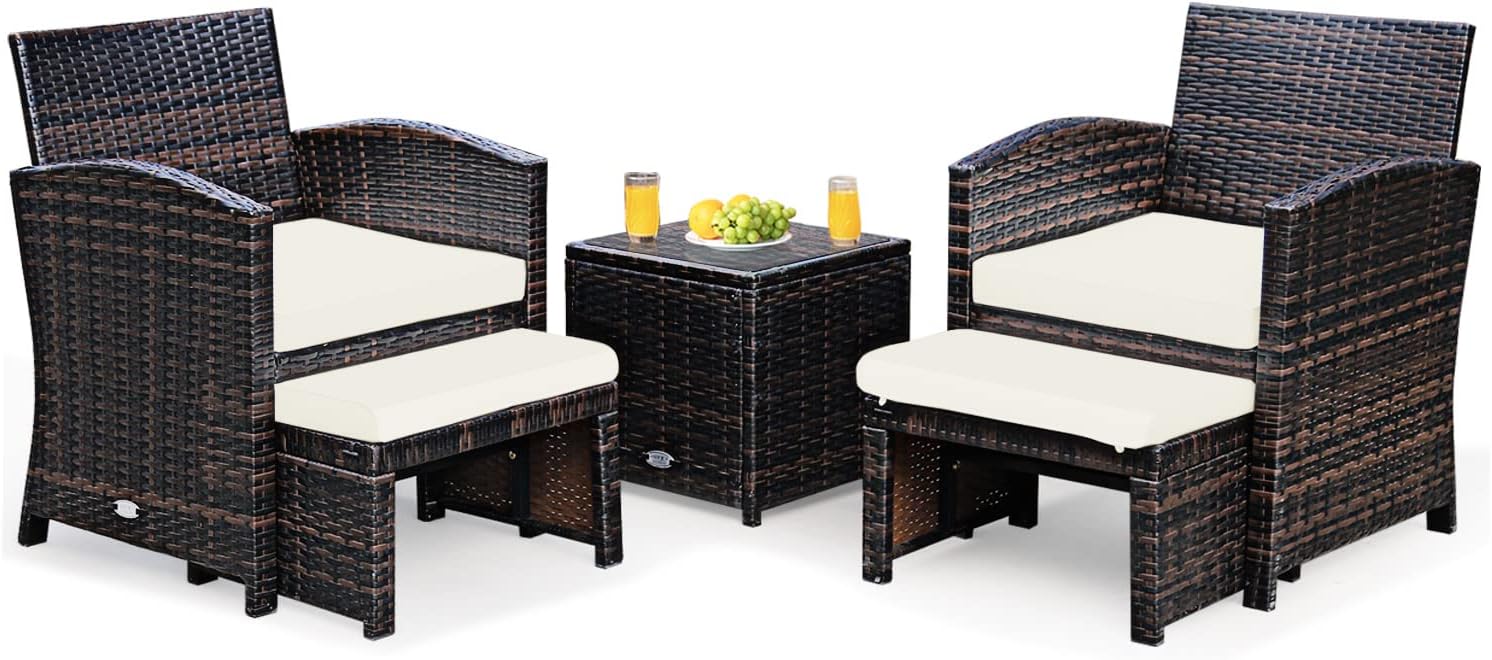 GOPLUS Juego de muebles de jardín de 5 piezas, polirratán con otomano, salón de jardín con mesa auxiliar, balcón y terraza, conjunto de asientos, color blanco