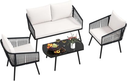 COSTWAY Conjunto Jardin Exterior de 4 Piezas, Tejido de Cuerda de PE, Sofá de 2 Plazas y 2 Sillas con Cojines, Mesa de Café de Vidrio Templado, Mesa y Sillas Terraza Balcon Exterior