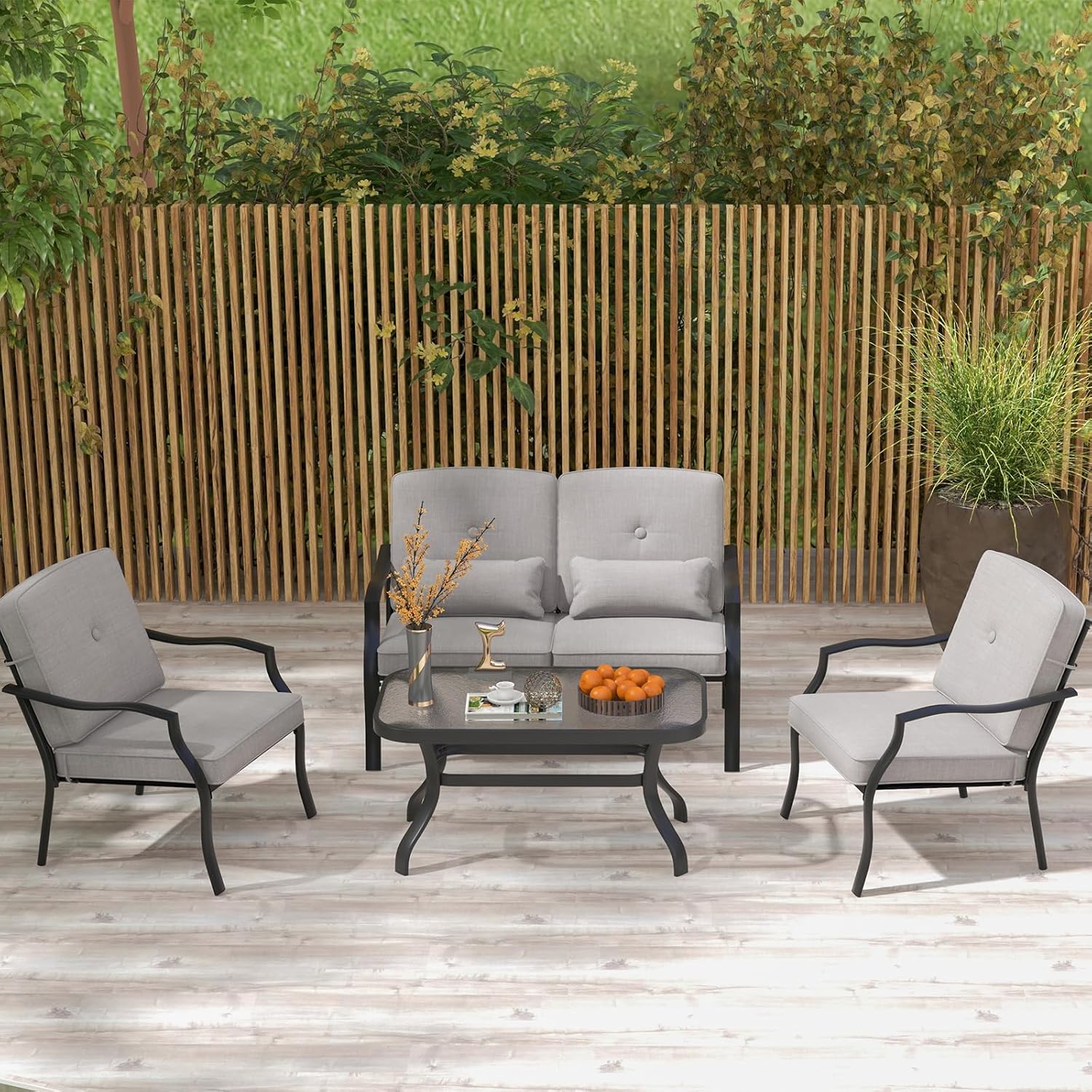 GIANTEX Juego de Muebles de Jardín 4 Piezas, Sofá de 2 Plazas y 2 Sillones, Mesa de Centro con Tablero de Vidrio, Cojines Suaves, Conjunto de Muebles para Patio, Balcón Gris