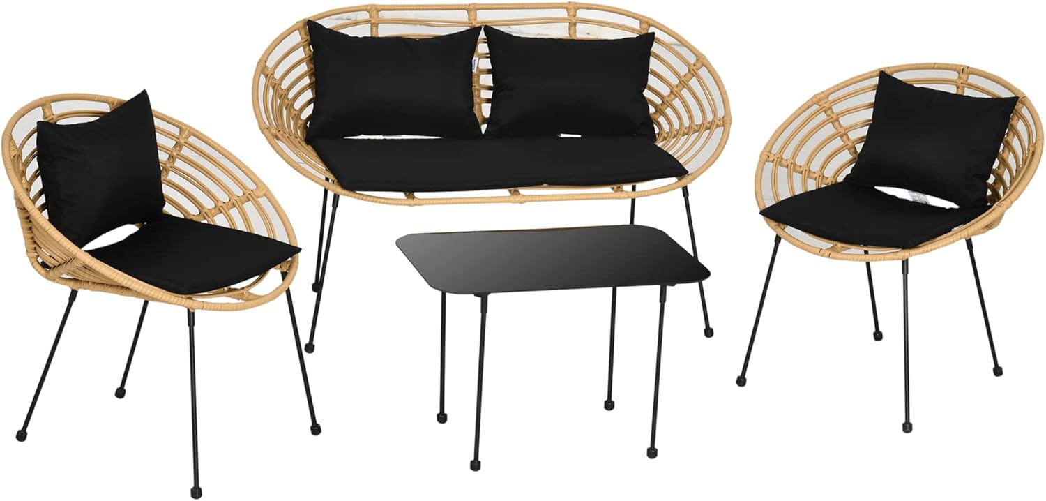 Outsunny Conjunto de Jardín Exterior de Ratán Sintético de 4 Piezas Muebles de Jardín Exterior Incluye 1 Sofá Doble 2 Sillones y Mesa de Vidrio con Cojines Natural y Negro