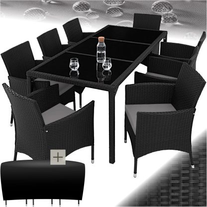 TecTake Conjunto Jardín Exterior de Ratán y Acero con Cojines, Muebles Jardín Exterior Resistentes a Intemperie, para hasta 8 Personas, Fácil Limpieza, 2 Fundas 1 Protectora - NegroGris